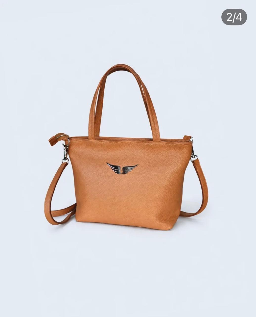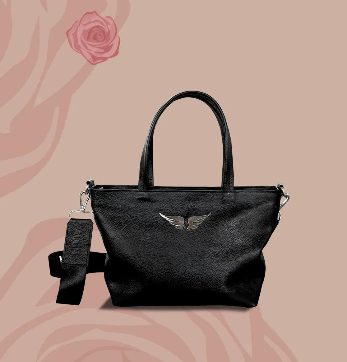 Cartera de tamaño mediano confeccionada 100 % en cuero vacuno con detalle de alas pequeñas PAULINE bordadas en el frente.